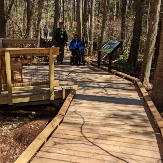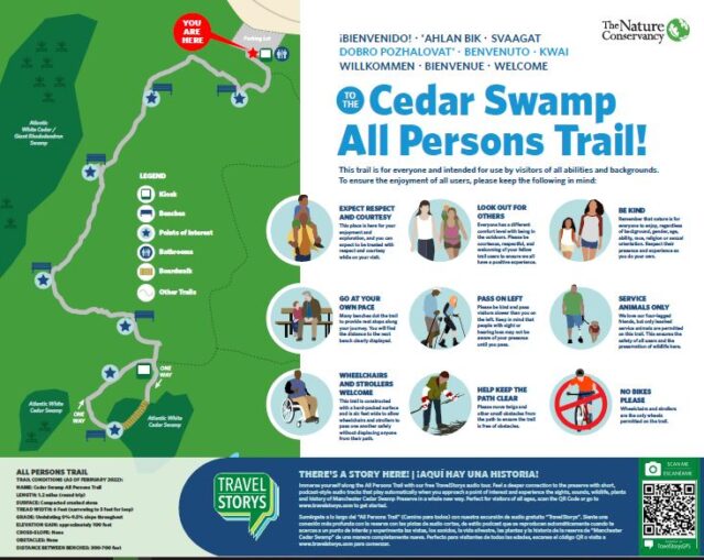 The newly constructed All Person’s Trail at the Cedar Swamp Preserve is open to the public. At 1.2 miles and ADA compliant, this trail will be enjoyed by all who wish to connect with nature. Being ADA compliant means that the trail surface is even, and easy to navigate. Additional features include: