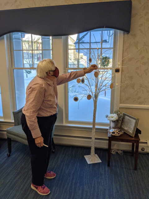 The tree is fittingly a birch style with lights in the branches. Residents and employees are invited to select an ornament, a wooden disc fitted with a chalkboard plaque to write on and express whatever invokes gratitude for them at the moment.