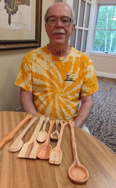 One of the woodworkers, Carl S., asked the Environmental Services Director to have some of the limbs saved when it was cut down. Carl used the pieces to make some small mementos of the tree: spoons, stirrers, spatulas, etc. to give to the residents affected by the loss of the tree.