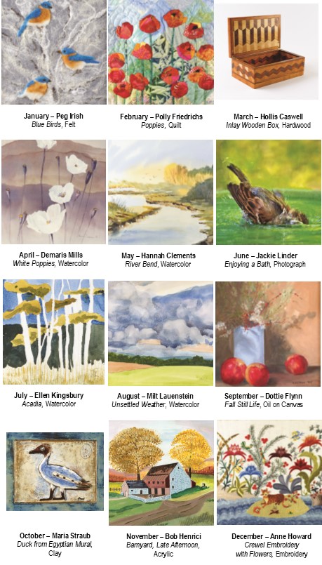 Resident Artists from all three campuses submitted over 100 works of art, from sculpture to embroidery to watercolor and oil, basket weaving, woodworking and so many more. The 2020 Art Calendar features 12 artworks selected by a group of Seacoast area art professionals: Deb Thompson, Owner of the Nahcotta Gallery, Maryellen Burke, former Executive Director of Discover Portsmouth, and Mary Jo Brown, founder and president of Brown and Company Design. We could not complete this project every year without the support of RAM Printing, who underwrites a portion of our costs.