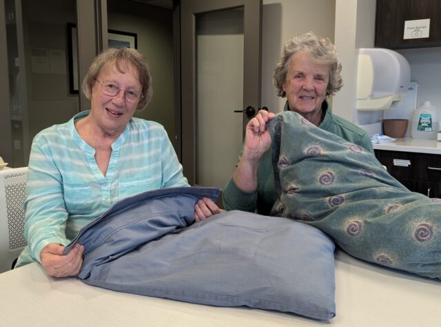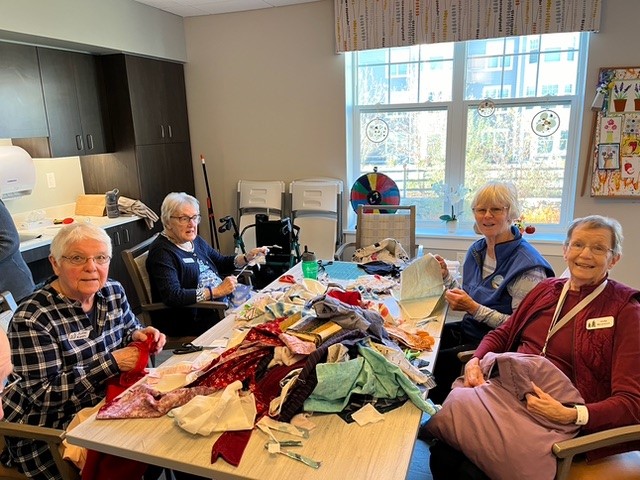 “Unlike the quilt project, this is one that we could easily share with residents in Supportive Living.” Jan shares. Mimi adds, “Some people really enjoy the release of ripping the scraps, some people fill the pillowcases, and others enjoy the feel of the fabric. It’s messy and it is a lot of fun.” She continues, “This project serves a few purposes reducing and, reusing fabric, benefiting the greater community, and bringing this community together on a project.”